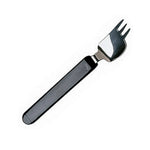 This lightweight cutlery consists of a knife/fork and knife/spoon and is designed for use with one hand only. The handle permits a secure grip and the cutting edge is on the underside of the blade to prevent injury to the corners of the mouth. The knife/fork is available in either righthanded and left-handed versions, while the knife/ spoon is suitable for both right-handed and lefthanded use